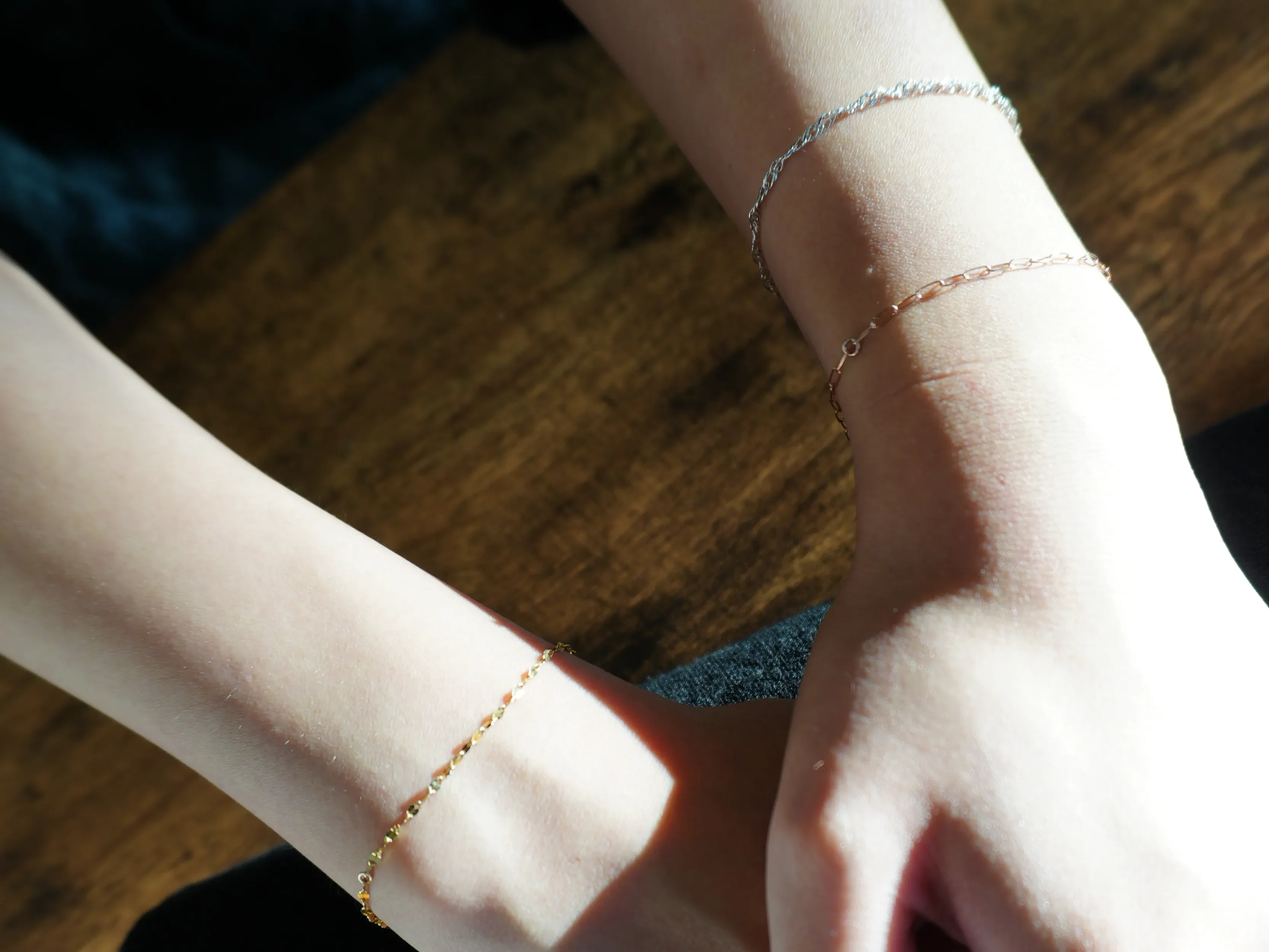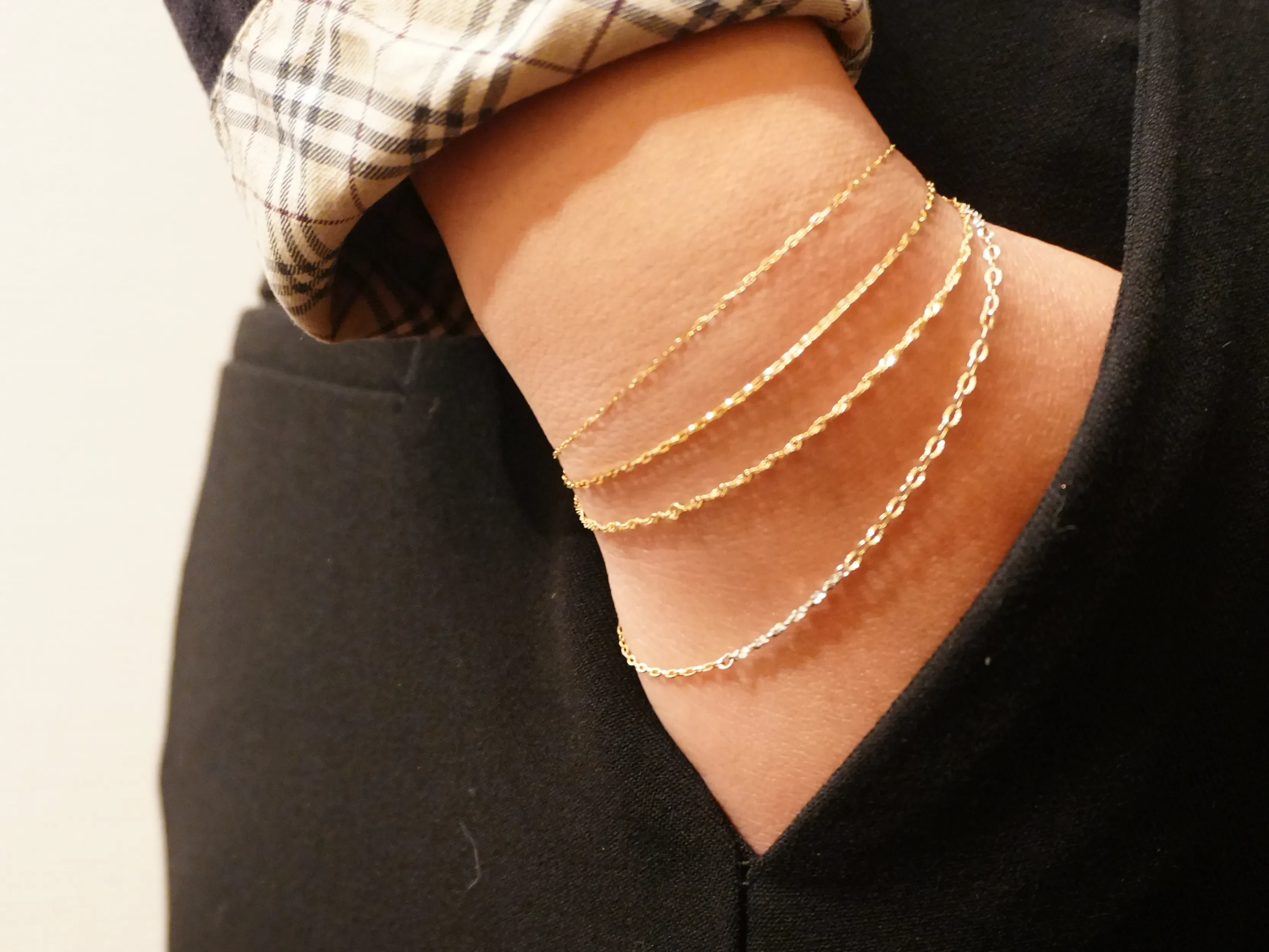 最もスタンダードで人気のあるスタイルです。PC作業中や家事の際も邪魔にならない、着けていることを忘れるほどの溶け込むデザインや装着感が魅力。ふとした瞬間に手首で輝くチェーンが、日常を特別にしてくれます。